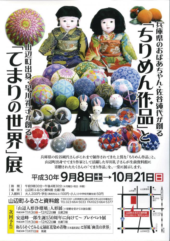ふるさと資料館では、「ちりめん作品」と「てまりの世界」展を開催しています。兵庫県のおばあちゃん佐谷純代さん創る、ちりめん布の巾着袋や人形の数々と、山辺町出身のてまり作家早川礼子さんの作品が一堂に展示されています。一つ、一つ色も模様も異なるかわいらしい“てまり”と、上質な“ちりめん作品”の世界をお楽しみ下さい。 「ちりめん作品」と「てまりの世界」□日 時 平成30年9月8日(土)〜10月21日(日)□時 間 午前9時30分〜午後4時30分(月曜日・祝日休館)□場 所 山辺町ふるさと資料館 北蔵□入館料 大人200円・学生(高校生以上)100円・小人50円□お問合せ先 山辺町ふるさと資料館 TEL:023−664−5033