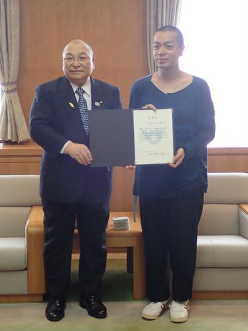 山辺町では2018年度から「ふるさと観光大使」の取組を開始いたしました。町出身者や町にゆかりのある著名な方に、町の特産品や観光などについて魅力を広く紹介いただき、観光振興や町産品の知名度向上を図ります。2018年4月1日より、山辺町出身で歌手の峯田和伸さん(銀杏BOYZ)に「ふるさと観光大使」をお願いしています。これまでの活動として、今夏出演したドラマの共演者の方々へ町産サクランボを紹介して頂きました。9月30日には、山辺町役場にて委嘱状交付式が執り行われました。交付後の懇談では今後の活動について町からお話しさせていただく中、町長の顔が編み込まれたニットに興味を示されるなど、和やかな一場面もありました。委嘱状やふるさと観光大使の名刺等を受け取った峯田さんは、「できる限り協力したい」と意気込みを語ってくださいました。