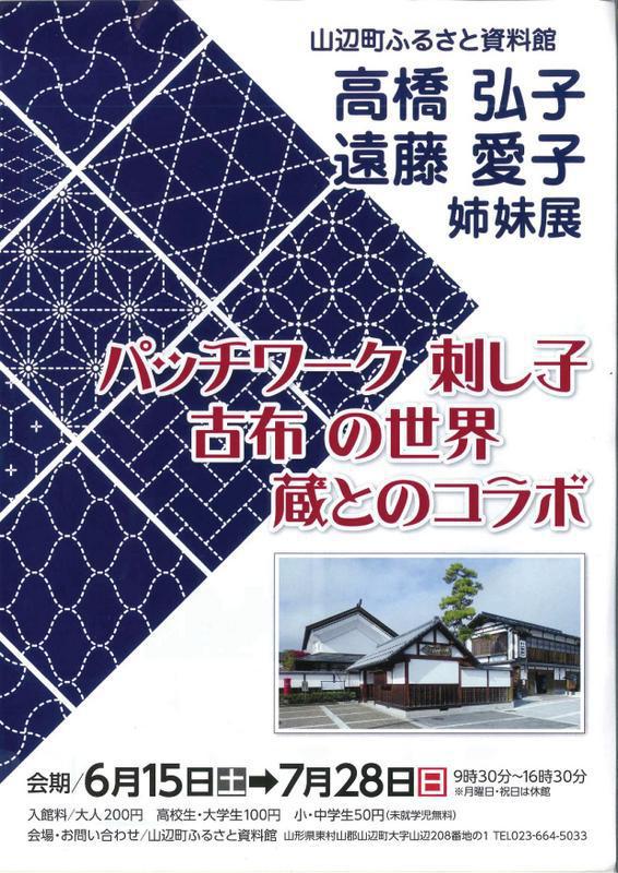 ふるさと資料館では、『高橋弘子・遠藤愛子姉妹展 パッチワーク 刺し子 古布の世界』を開催しています。ふるさと資料館の歴史ある蔵の中で、高橋弘子・遠藤愛子姉妹が創る繊細で独創的な、パッチワーク・刺し子・古布の世界をお楽しみ下さい。 『高橋弘子・遠藤愛子姉妹展 パッチワーク 刺し子 古布の世界』会 期 2019年6月15日(土)〜7月28日(日)時 間 9時30分〜16時30分 ※月曜・祝日は休館入館料 大人200円 高校生・大学生100円 小・中学校50円会場・お問合せ先 山辺町ふるさと資料館 [TEL]023−664−5033