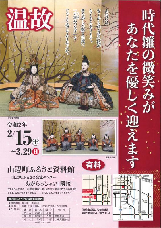 ふるさと資料館では、2月15日(土)より『やまのべひな人形展』を開催します。山辺町には、江戸時代より最上川舟運や紅花交易で取り寄せたとされる貴重な時代雛の数々が残されています。寛永雛・元禄雛など年代によってそれぞれ異なる時代雛の個性あふれる表情などじっくりご覧いただけます。また、3月1日(日)からは、『まちなか雛ミュージアム』が開催されます。ふるさと交流センター「あがらっしゃい」には現代雛が展示され、周辺の商店街と一緒にたくさんの楽しいイベントが開催されます。1日はオープニングイベントが行われ、雛の衣装を着た子供達が人間雛となり街歩きをします。山辺町でしか見る事のできないお雛様達をぜひご覧ください!! 【やまのべ雛人形展】 ◇開催期間 2020年2月15日(土)〜3月29日(日) ◇開催会場 山辺町ふるさと資料館 ◇開催時間 午前10時〜午後4時 ※月曜日休館(3/20春分の日は開館) ◇入館料 大人200円、学生100円、小人50円 ◇お問い合わせ先 山辺町ふるさと資料館 [TEL] 023−664−5033 【まちなか“雛”ミュージアム】 ◇開催期間 2020年3月1日(日)〜3月29日(日) ◇開催会場 ふるさと交流センター「あがらっしゃい」・町内雛人形展示協力店 ◇開催時間 各店舗営業時間内 ◇料 金 無料