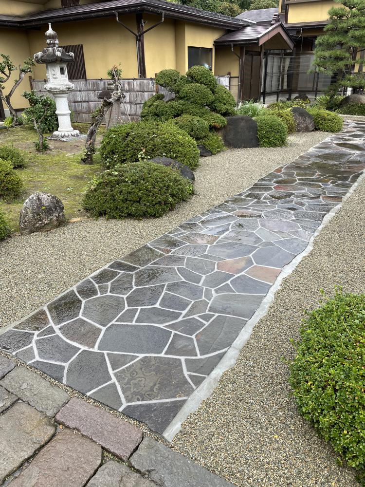 先日、弊社がある山辺町内のある寺院様にて施工させていただいた鉄平石の乱張りです。写真は完成後の通路を洗浄機にて掃除後の画なのですが個人的にも雨上がりなど、しっとりと表面が濡れている画がとても好きです!
