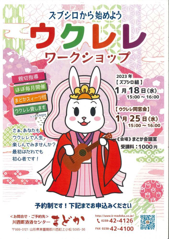 2022.ズブシロから始めよう♪ウクレレワークショップ12月日程 12月7日(水)【ズブシロ組】15:00〜16:00 12月14日(水)【同窓会組】15:00〜16:00※親切指導・ほぼ毎月開催・まどか特製スイーツ付・※希望者ウクレレレンタル有(別料金)※予約制です 0238-42-4126までお申し込み下さい