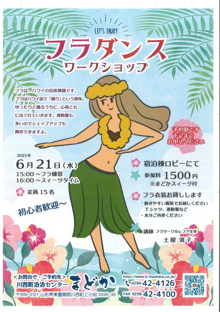 6月21日(水)フラダンスワークショップ開催♪15:00〜フラ練習16:00〜スイーツタイム参加費:1,500円込(まどかのスイーツ付き)場所:宿泊棟ロビー定員:15名※フラ衣装お貸しします。初心者大歓迎♪ 動きやすい服装でお越し下さい。 水分ご持参くださいお申し込みは浴浴センターまどかまでお電話で!! TEL:0238-42-4126