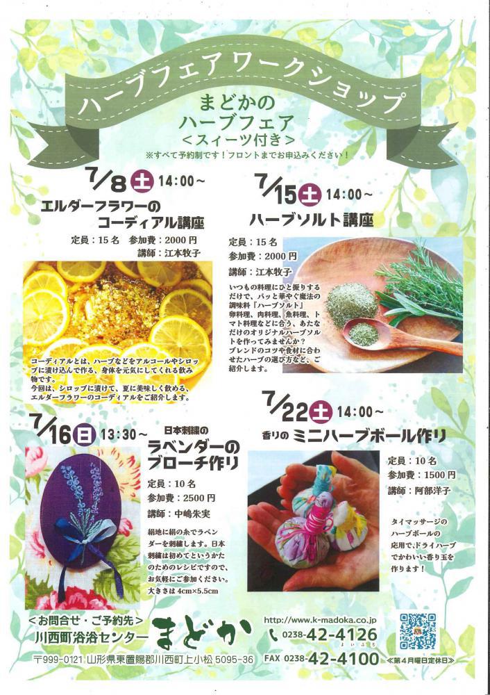 まどかでは、7月期間中ハーブフェアワークショップ開催いたします。★7/8(土)14:00〜 エルダーフラワーのコーディアル講座 定員:15名 参加費:2,000円 講師:江本牧子★7/15(土)14:00〜 ハーブソルト講座 定員:15名 参加費:2,000円 講師:江本牧子★7/16(日)13:30〜日本刺繍のラベンダーブローチ作り 定員:10名 参加費:2,500円 講師:中嶋朱実★7/22(土)14:00〜香りのミニハーブボール作り 定員:10名 参加費:1,500円 講師:阿部洋子※各コース事前予約となっております。 お早目のご予約お待ちしております。 まどか Tel:0238-42-4126