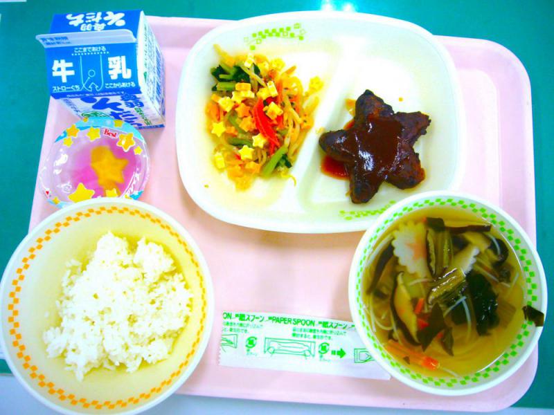 7月7日の給食は七夕の特別献立でした。メニューは・・・星ハンバーグ、チーズおかか和え、七夕汁、七夕ゼリー、ごはん、牛乳でした。2年生、「広報いいで」と同じような表情でおいしそうに食べています。これ、うらやましいです。私も食べたかった〜〜