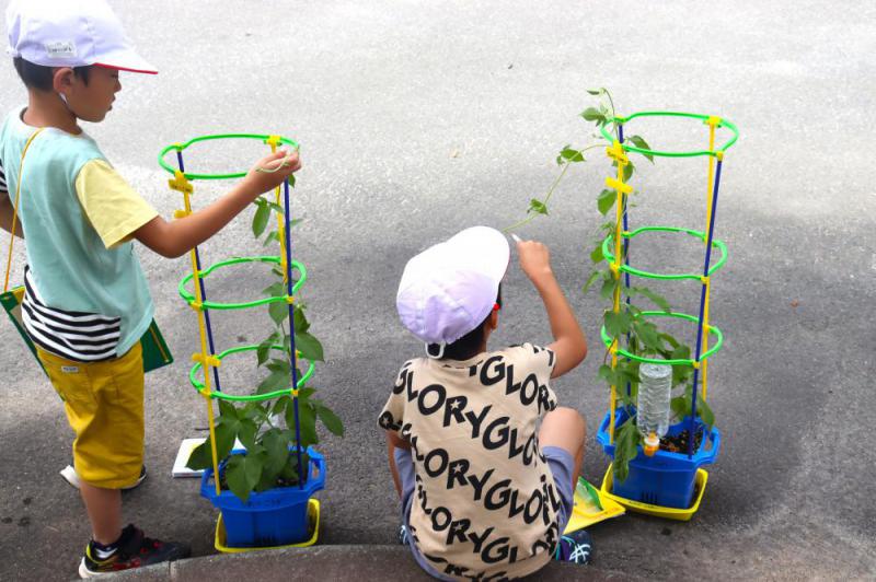 7月11日、1年生がアサガオの観察を行いました。先日よりさらにつるが伸び、花のつぼみが出ていたようです。また、花が咲いた子もいたようです。手で触れたりのぞき込んだりしながら、しっかりと観察できました。