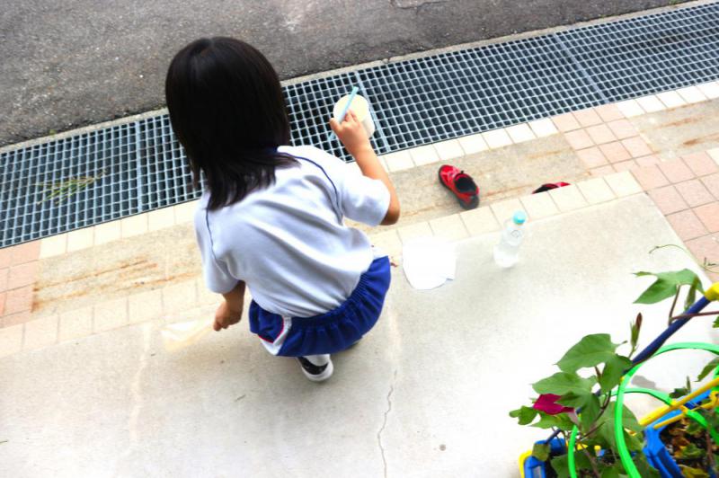 7月18日、1年生がしゃぼん玉で遊んでいました。ストローやうちわの骨を使って、楽しくしゃぼん玉をつくりました。いかにも夏という感じがします。