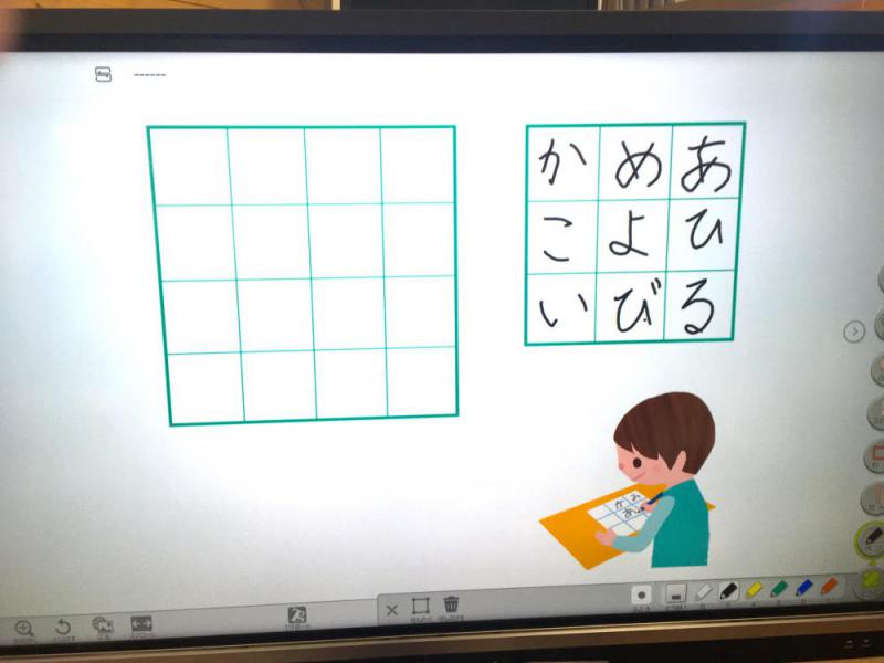 1年生の国語の学習の様子です。たて、横のますに、3文字のひらがなを入れて埋めていく学習でした。ひらがなの表も見ながら、みんながんばって見つけていました。3文字が終わったら4文字に挑戦し、意欲的に学習していました。