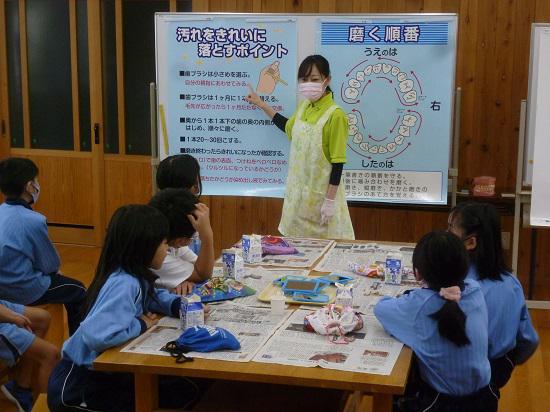 11月2日、県の歯科衛生士さんをお招きし、1年生から6年生まで、学年ごとにブラッシング教室を行いました。まずは、正しい歯ブラシの選び方から教えていただきました。自分の指の幅と同じくらいの幅の歯ブラシが自分に合っている歯ブラシであることを学びました。次は、歯ブラシの交換時期そして磨き方やその順序についても丁寧に教えていただきました。詳しくはお子様にお聞きください。お話をお聞きした後、実践です。綿棒を使って、染め出し液を歯に塗っていきます。赤く染まった歯を歯科衛生士さんの指導の下、鏡を見ながら、きれいにブラッシングできました。普段なかなかできない体験でしたので、一人一人の歯磨きに対する意識も高まったように思います。家でも今日勉強したことを思い出しながら、歯を大事にする気持ちを持ち続けてほしいなあと思います。