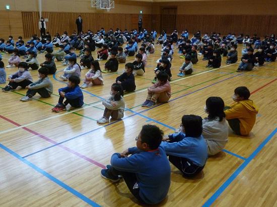 11月14日、朝からとても寒い体育館でしたが、予定通り全校朝会が行われました。今日の内容は、養護教諭からの生活リズムについてのお話でした。特に、1学期の生活リズム調査や学校評価アンケートでも課題として挙げられた「メディア」を取り上げました。使い方によっては、メディアが脳に悪影響をもたらすことや、丈夫な心身を作るうえで危険分子になりうることなどを、図を通しながら具体的に指導しました。お家の皆様にも引き続き「我が家の約束」をご確認いただき、ご協力くださいますようよろしくお願いいたします。さて、全校朝会への入退場の仕方が、今日(今日は退場のみ。次回から入退場の予定です。)から変わりました。音楽に合わせて行進をします。これは、状況に合わせた体の動きや力の加減を調整する能力を高め、集団美や所属感を高めることをねらいとします。新たな試みでしたが、全校生しっかりと行進している姿が印象的でした。