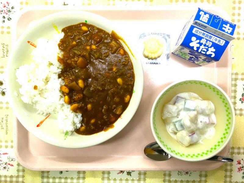 本日の給食は「めざみ産デー」でした。メニューは・・・ビーンズカレー、フルーツヨーグルト、型抜チーズ、ごはん、牛乳でした。3年生の教室におじゃましました。みんなカレーをおいしそうに食べていました。デザートのヨーグルトも楽しみのようでした。ごちそうさまでした。