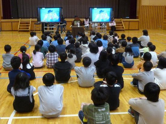 11月21日から12月1日まで、本校の読書まつりが開催されています。その取り組みの一つとして、11月30日の朝の時間、あ〜すまいり〜ずの皆様から、特別読み聞かせをしていただきました。これまでは各教室で学年ごとに行ってきましたが、今回は1年生から3年生までの一っ子が体育館に集まり、紙芝居を読み聞かせしていただきました。特別ゲストも登場するなど、みんなくぎ付けの貴重な時間になりました。この企画は来週の木曜日にも行われる予定です。どうぞ楽しみにしてください。(紙芝居の内容はぜひお子様にお聞きください。)