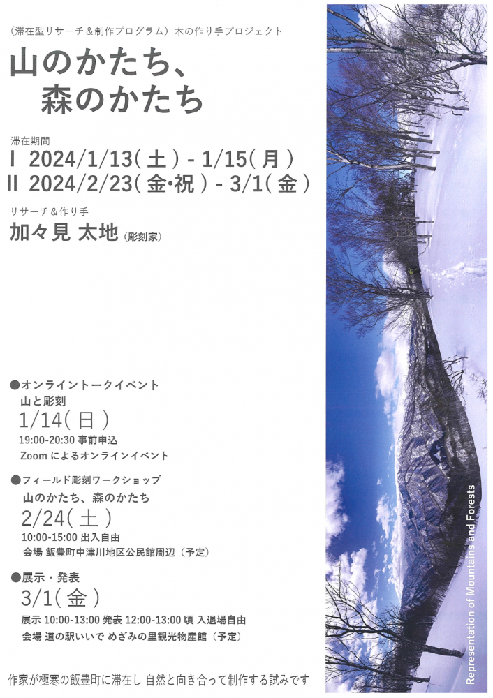 飯豊連峰の山麓にある飯豊町は、84%を森林が占めています。その飯豊の森をリサーチしながら、彫刻家の加々見太地さんが、滞在制作を行います。滞在期間中、オンライントークイベントやワークショップ、展示会を行いますので、ぜひ、お越しください。<オンライントークイベント>日時:令和6年1月14日(日)19:00〜20:30参加方法:ZOOM申込方法:チラシの二次元コードから申込ください。<ワークショップ>日時:令和6年2月24日(土)10:00〜15:00(お好きな時間にお越しください。)会場:中津川地区公民館周辺予定(決まり次第飯豊町木の作り手プロジェクトInstagramでお知らせ)参加費:300円※防水手袋持参、また濡れても良い服装でお越しください。<展示会>日時:令和6年3月1日(金) 展示:10:00〜13:00 発表:12:00〜13:00会場:道の駅いいで めざみの里観光物産館問合せ先:飯豊町中津川の森人会(kawauda2014@gmail.com)詳細はコチラ