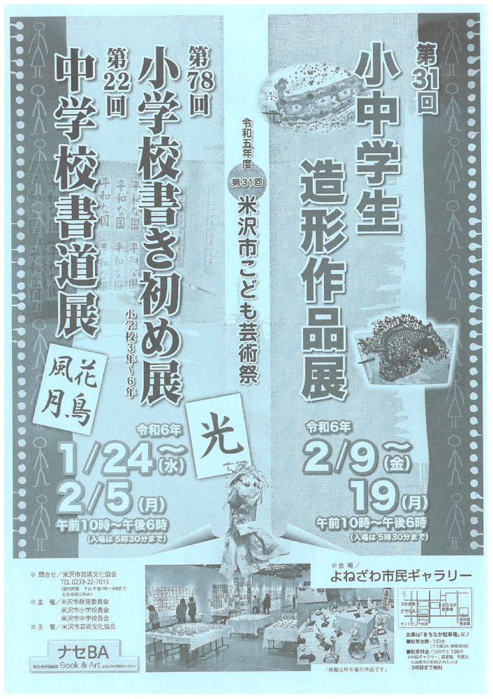 よねざわ市民ギャラリーにて、「第31回米沢市こども芸術祭」が開催されます。小中学生造形作品展や小学校書き初め展、中学校書道展が行われます。ぜひ、ご来場ください。<開催日時>・小学校書き初め展、中学校書道展令和6年1月24日(水)〜2月5日(月)10:00〜18:00・小中学生造形作品展令和6年2月9日(金)〜19日(月) 10:00〜18:00<場所>よねざわ市民ギャラリー<料金>無料詳細は、チラシをご覧ください。<問い合わせ>米沢市芸術文化協会 TEL:0238-22-7015詳細はコチラ