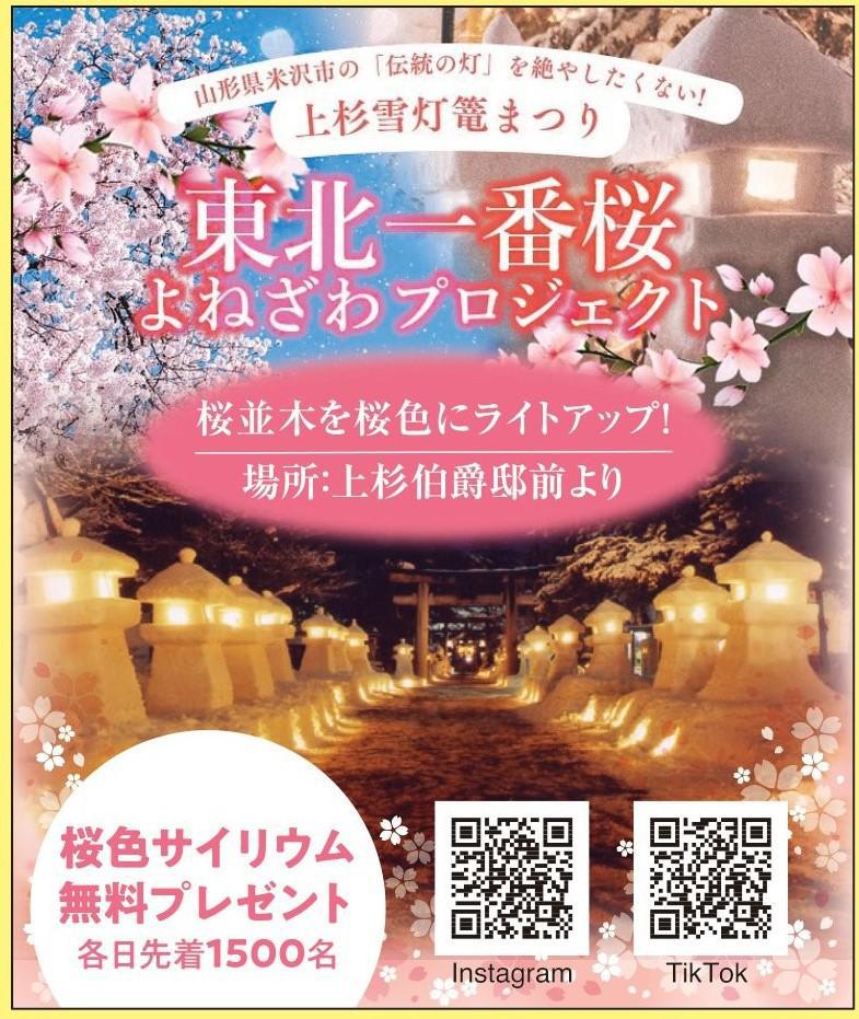 今年の上杉雪灯篭まつりは、会場を桜色でライトアップ!地域の伝統を次世代に繋ぎ、地域の魅力をさらに磨き上げるために、地域内外の団体、学生、社会人が一緒になって「東北一番桜よねざわプロジェクト」が立ち上がりました。冬に満開の桜が咲いている風景を作りだす「桜ライトアップ」、東北一番の春をお届けします。また、ライトアップ点灯に合わせ、各日先着1500名に「桜色サイリウム」を無料プレゼント!雪と桜のコラボレーションを体感しにぜひお越しください! ◇開催日時 2024年2月10日(土)・11日(日)      両日18:30頃点灯 ◇「桜色サイリウム」配布場所  16時〜配布開始 上杉伯爵邸和庭(なごみてい)前  上杉雪灯篭まつり会場インフォメーション 上杉雪灯篭まつり会場テント村 上杉雪灯篭まつり公式ホームページはこちら