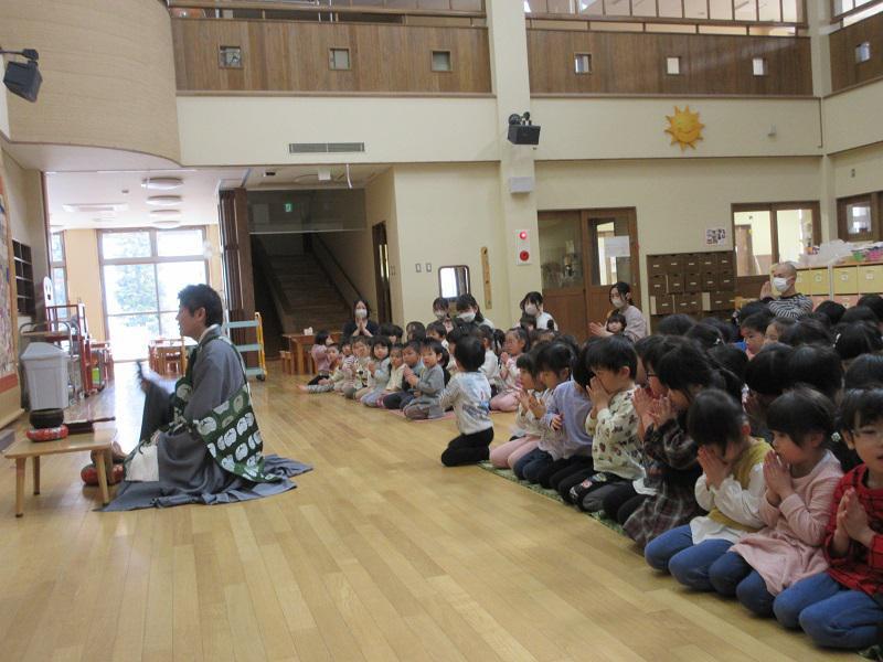 2月15日はお釈迦様のご命日です。東部保育園ではこの日、お釈迦様が亡くなったときの様子を描いた「涅槃図」を飾り、「涅槃会(ねはんえ)」と呼ばれる法要を行いました。園長先生がお経をお唱えし、その後お釈迦様が亡くなったときのお話をしてくださいました。自分の一度きりの人生を懸命に生きていきたいものです。真剣な表情で園長先生のお話を聞く子どもたちでした。