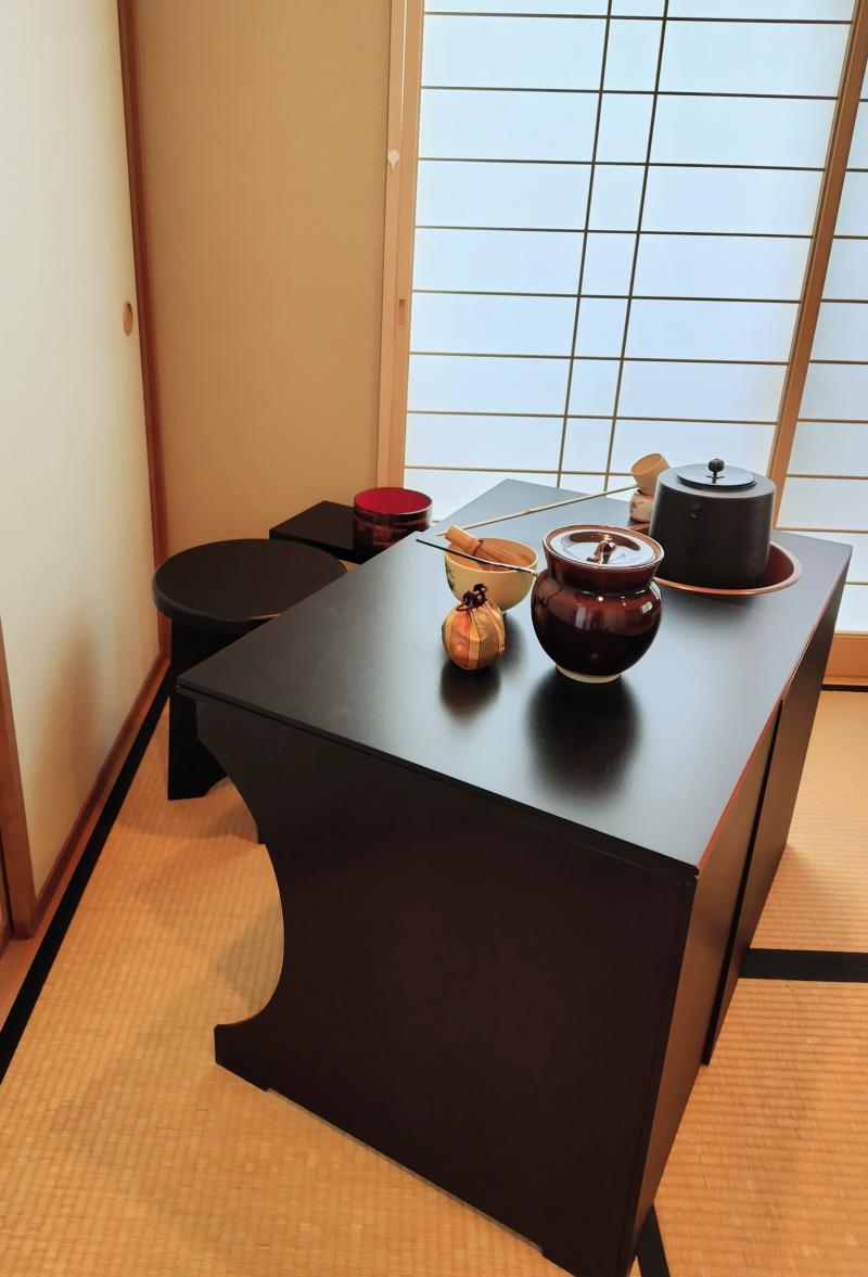 膝関節症で正座ができない私のために、椅子に腰かけて茶道のお稽古ができる、コンパクトな「立礼卓」(りゅうれいじょく)を