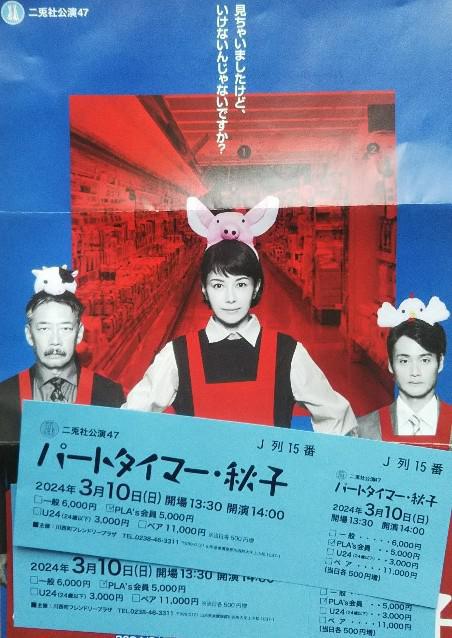 昨日川西町フレンドリープラザで『パートタイマー・秋子』を観てきました・・作・演出 永井愛で出演が 沢口靖子、生瀬勝久、亀田佳明他、土井ケイト、 吉田ウーロン太、 関谷美香子、稲村梓、 小川ゲン、 田中亨、 石森美咲、水野あや、 石井愃一という顔ぶれ、スーパー「フレッシュかねだ」でパートを始めた、セレブな主婦・秋子。世間知らずで他のスタッフから浮いてしまう秋子、主人が失業し、しょうがなくパートを始めている、そこには大手企業をリストラされ、屈辱に耐えながら働く貫井がいてという設定で始まる……2003年作ということです・・当時リストラの嵐や食品の偽装とか不正が横行していた頃、時代背景が見えますね・・あれから21年だそう・・当時東芝からNECと東芝の合併会社に移動した頃でした・・不安と期待の新職場、そういえば生瀬さんに似た感じの上司がいたっけね、懐かしく思い出しました。話はさえない店長派と、ぐーたらバイトの反店長派の対立・・そこに、世間知らずの奥様役、沢口靖子さんが良くはまってましたね。世の中の悲喜こもごもが渦巻いている・・あるある話のようでねーー、正義を貫いてスーパーが盛り上がると思いきや、不正に染まっていくという、ちょっと残念なとこがある、店長役の役者さんは、お母さんが天童出身という‥凄く、はまり役ででしたね・・とても面白かった、生瀬勝久の「焼肉ヨーデル」のスイス風の節回や皆さんでの歌、傑作でした・・ここは盛り上がりました、ごくせんのドラマでの生瀬さんの教頭役が好きでした、ほんとに喜劇度は非常に高い生瀬さん、沢口さんもキレイ、カワイかった〜