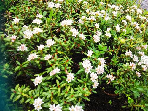 吾妻連峰の人形石に咲くミネズオウ。6月18日に行った時のもの、和名の蘇芳(スオウ)は、イチイのこと。葉がイチイに似ていること、高い峰に生えることから、由来となっている。山上に生えるスオウの意味。人形石周辺に群生している。