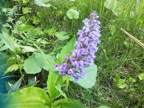 天元台高原リフト下、ゲレンデでよく咲いてます、淡紅紫色の花を穂状に多数つける。和名の由来は、近縁のテガタチドリの肥厚した根茎の形が掌状で「手形」であるのに対し、本種の根は掌状にならず、伸びるため「延根」という。