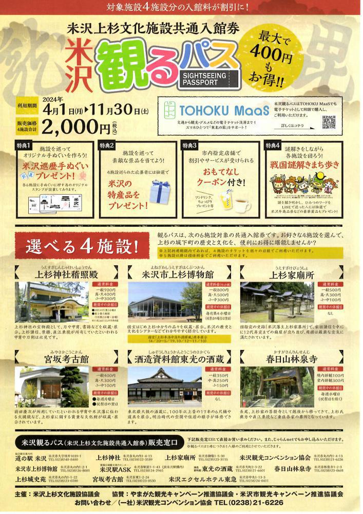 The Yonezawa Sightseeing Passport is a special ticket that lets you enter 4 out of Yonezawa’s 6 main tourist attractions without having to buy extra entry tickets, and it’s now up for sale!Enjoy Yonezawa conveniently with this bargain of a deal! If you’d love to learn about the history and culture of Yonezawa castle town back in the day, then the Sightseeing Passport is perfect for you!Using the passport comes with the following bonuses:– Yonezawa-themed tenugui (traditional Japanese handtowel)– A chance to participate in a lucky draw to win various prizes like local specialty products– Assorted coupons that can be used in stores in Yonezawa– A chance to enter a lucky draw for various goodies if you solve the riddles at each site and send your answers over LINE!Sale Period: 1st April 2024 (Monday) ~ 30th November 2024 (Saturday)Price: 2,000 yen (Tax included)Facilities Covered by the Sightseeing PassUesugi Shrine KeishodenThis building serves as the Uesugi Shrine’s treasure house which stores and displays swords, armour and many more. The swords and armour used by Uesugi Kenshin, Uesugi Kagekatsu, and Naoe Kanetsugu are must-sees!Yonezawa City Uesugi MuseumThe museum stores and exhibits various artifacts that have connections to the Uesugi clan, including national treasures! Equipped with a mini theater, the museum introduces visitors to a breakdown of the history and culture of Yonezawa through various means. The national treasure, Rakuch? Rakugaizu By?bu (Uesugi Version), is also on display from 20th April to 19th May, and from 12th October to 10th November.Uesugi MausoleumLocated at the nationally designated heritage site, Yonezawa Domain Lord Mausoleum, the facility houses the remains of an extensive line of domain lords, from Uesugi Kenshin at its center to the 12th generation lord, Uesugi Narisada. A solemn atmosphere permeates the grounds.Miyasaka KoukokanThis museum collects and displays various pieces of armour that were said to be collected by Maeda Keiji himself. Important cultural artifacts dating back to the Yonezawa domain’s days, such as those relating to the Uesugi clan as well as matchlock guns, are also exhibited here.Toko Sake WarehouseThe grandest sake warehouse in the Tohoku region which displays sake manufacturing equipment, including 17 sake barrels that are 1.8 metres wide and deep, that dates over 100 years back. You can also experience how it was like to live in the Meiji period for yourself.Kasugasan RinsenjiThis temple is the bodaiji (similar to an ancestral temple where the deceased family members are cared for) of the Uesugi clan and it was relocated to Yonezawa together with the clan when they moved out of the Echigo province. It is the resting place for the wives in the Uesugi clan as well as chief retainers such as Naoe Kanetsugu.Yonezawa Sightseeing Passport Vendors1. Yonezawa Station ASK information counter 1-1-43 Ekimae, Yonezawa (In Yonezawa Station) TEL (0238) 24-29652. Yonezawa Tourism & Convention Bureau 1-4-13 Marunouchi, Yonezawa TEL (0238) 21-62263. Michi no Eki Yonezawa 1039-1 Oaza Kawai, Yonezawa TEL (0238) 40-84004. Yonezawa City Uesugi Museum 1-2-1 Marunouchi, Yonezawa TEL (0238) 26-80005. Uesugi Joshien 1-1-22 Marunouchi, Yonezawa TEL (0238) 23-07006. Uesugi Shrine 1-4-13 Marunouchi, Yonezawa TEL (0238) 22-31897. Uesugi Mausoleum 1-5-30 Gobyou, Yonezawa TEL (0238) 23-31158. Miyasaka Koukokan 1-2-24 Higashi, Yonezawa TEL (0238) 23-85309. Toko Sake Warehouse 2-3-22 Oomachi, Yonezawa TEL (0238) 21-660110. Kasugasan Rinsenji 1-2-3 Rinsenji, Yonezawa TEL (0238) 23-060111. Yonezawa Excel Hotel Tokyu 1-13-3 Chuo, Yonezawa TEL (0238) 24-0411Flyer PDFThe Yonezawa 1-Day Bus Pass is also on sale now!ContactYonezawa Tourism & Convention BureauTEL 0238-21-6226