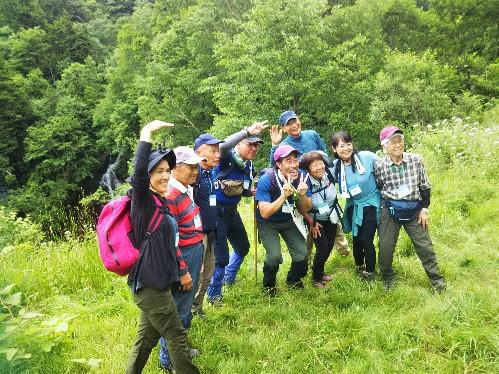 福島出身のタレントなすびさんを講師に招いた企画「天元台トレッキング&キャンプ〜高原で過ごす2DAYS〜」に参加、キャンプ&トレッキング体験してきました。初日講話の後、フィットネスそして、山ご飯して午後、天元台高原から最上川源流散策トレッキングとして”明道の滝”までのトレッキング、あいにくの曇り空ですが、暑くなくてよかった、高原のアルブ前1350mから旧セミナーハウスを通り滝の見える展望場所へ、緩い下りです・・そこまでは車も通れる道路なんで、小さいお子さんでもOKです,30分もあれば展望箇所へと・・思い思いの記念撮影して・・それにしても”なすび”産の顔で買いです、身長も180p、ガタイもでかいですね、一緒のとってもらったけど滝が角度悪く、入ってなくがっかり・・・最初、降ってなかったけど、記念撮影し休憩してたら雨が降ってきて、カッパでのトレッキング・・雨は嫌いですわねー