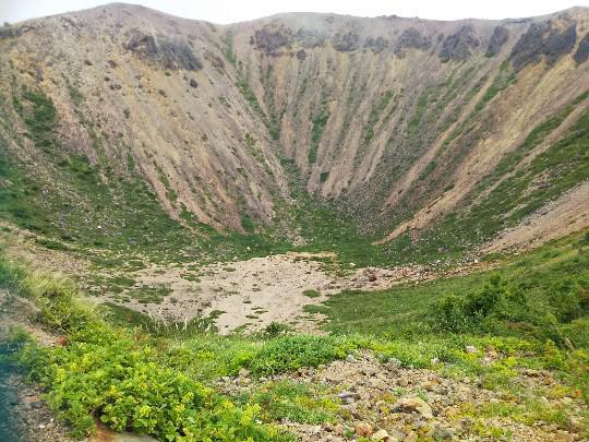 吾妻小富士は、浄土平駐車場から磐梯吾妻スカイラインを横断して、木の階段をジグザグと登ること約10分で着ける、観光客が普段着で登れるところですね、大きな噴火口が間近に覗くことができました・・ここの火口は水がたまらないのですね・・ザレた滑りやすい道、この日は安増天気が良くなく、ガス視界で福島市街の一望はかないませんでした。吾妻小富士の噴火口は、約40分から1時間で一周することができます。小型の富士山を思わせ、地元の人々にも古くから親しまれている名山ですね・・直径約500mの火口の眺めは圧巻、火口底までの高低差は約70mとのことです