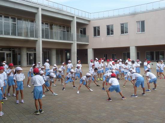 8月23日、2学期の体力アップタイムが始まりました。今朝は山形県に熱中症警戒アラートが発表されておりましたが、グラウンドでのWBGTを計測し、数値が26.5、微風という環境でしたので、帽子をかぶり短時間での走練習を行いました。10月に予定されています中距離走大会に向け、自分の目標に向かって一生懸命に走る一っ子たちの姿がありました。また、今年度の重点の一つである短距離走の力をつけるための、ダッシュやラダーやミニハードルを使った練習などにも意欲的に取り組んでいました。思いっきり走って汗をかいた後は、ミストで涼しそうにクーリングしていました。幸せそうな顔が最高でした!!
