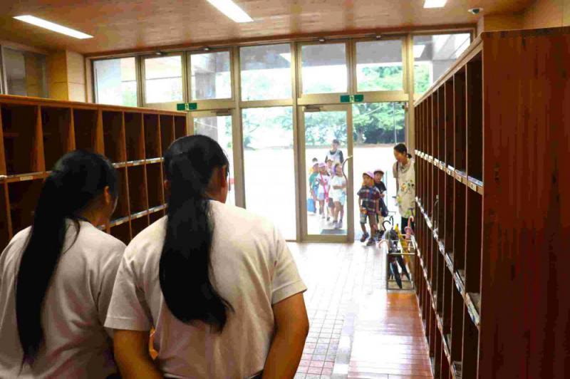 すくすくこども園の年長児さんが、10月7日の就学時健診の下見のために来校しました。今日は、就学時健診で使う部屋の紹介と健診の説明を行いました。職場体験中の中学生もお手伝いです。少し緊張した様子でしたが、みんなとてもしっかりしていて、お話もきちんと聞けました。1年生の教室では、いすに座って一足早い入学気分です。10月7日、待っています。