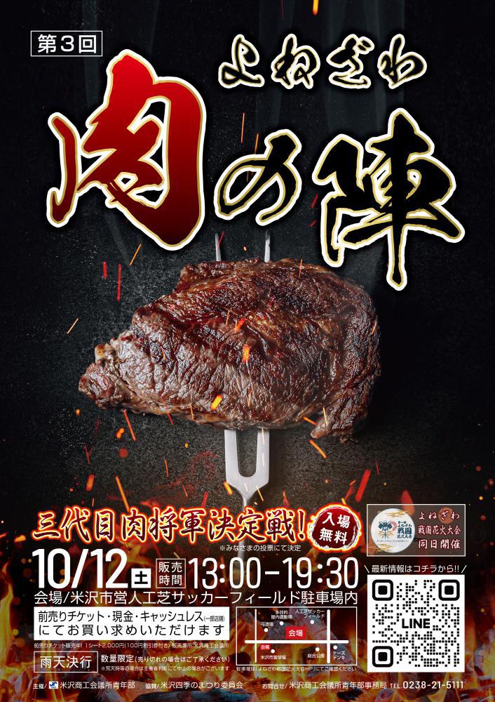 「第3回よねざわ肉の陣」が、今年も開催されます!米沢市営人工芝サッカーフィールド駐車場内を会場に、牛・豚・鶏・羊・馬・ジビエの肉が一挙集結します!本イベントでは、会場での投票で『肉将軍』が決定します。三代目肉将軍に選ばれるのはどの店舗か!皆さまのお越しをお待ちしています!※第1回よねざわ戦国花火大会、同日開催→公式サイト◇開催日時 2024年10月12日(土)13:00〜19:30※雨天決行◇会 場 米沢市営人工芝サッカーフィールド駐車場内※入場無料※数量限定(売り切れの場合はご了承ください)◇前売チケット 1シート2,000円(100円割引券付) 販売場所:米沢商工会議所 TEL:0238-21-5111※当日は現金(キャッシュレス店舗も有り)でもお買い求めいただけます。詳細はよねざわ肉の陣公式ホームページをご覧ください。◇お問い合わせ 米沢商工会議所青年部事務局        TEL:0238-21-5111