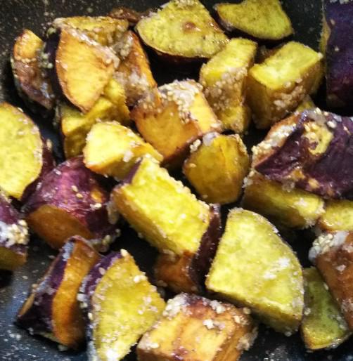 我が家のサツマイモ(紅あずま)掘りして、さっそく大学芋作りました。ところで”大学芋”の由来ですが、東京の学生街「本郷」で、このおやつが学生たちの間で人気だったことから来ていると言われています。当時の学生たちには安価でおなかを満たす、最適なおやつだったのですね。大学芋は芋をゴロッとした大きめの乱切りにしていることが多いのに対し、小さめの正方形に切られているのは、サイズが小さいことから、中学芋と名付けられている・・知らんかったね