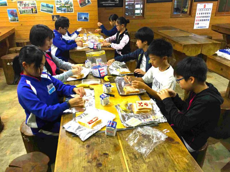宿泊学習2日目、朝の子供たちの様子を確認してきました。みんな元気で何よりでした。すでに7時前から朝食づくりの準備をしていました。ホットサンドを作りに挑戦です。パンに具を挟み、アルミホイルで巻き上げた後、牛乳パックに入れて火をつけて待ちます。事前の学習がとてもしっかりできていたようです。みんな、おいしい朝食をいただきました。