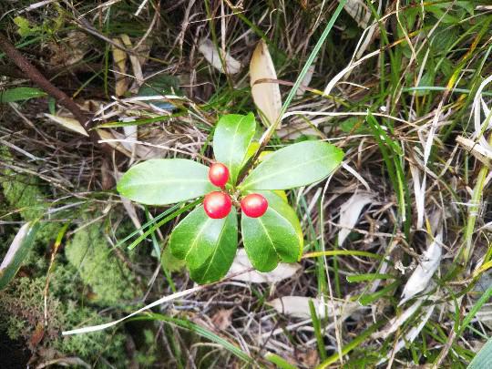 9月29日木道整備で出かけた西吾妻山、大凹付近で撮りました。主に日本海側に分布する。”ツルキシミ”、果実は直径約1p程度の球形、赤色に熟す。常緑低木で、葉は互生します。本州関東以西、四国、九州に分布しているミヤマシキミの雪国型の品種で、幹の基部が地を這うようなのでツルシキミとなったということです。花は4〜5月、白い小さな花を多数咲かせます。赤い実がさもおいしそうになっていますが、普通にはこれは有毒とされています。煎じた汁を虫下しに使ったとされていますし、鹿のいる所で鹿が食べないというのもやはり毒の証とのことです。