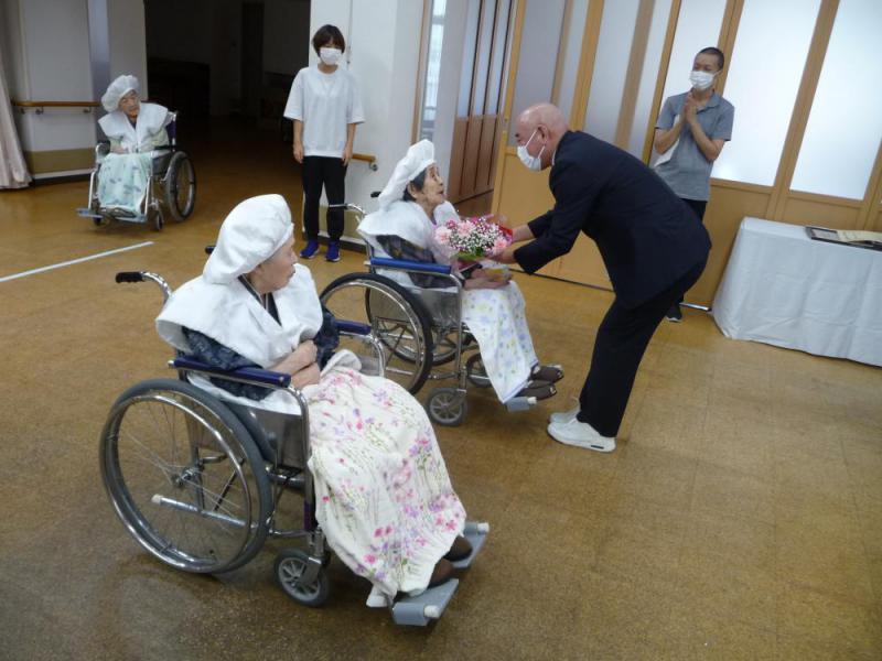 9月18日(水)、花の里では敬老式典が執り行われました。新型コロナウイルス感染症が収束していない状況である事や、来賓の方々と施設利用者・職員の健康と安全を最優先に考え、施設利用者・職員のみで行いました。その為、長寿、百寿、白寿、米寿、喜寿の方々に、頂戴致しました賞状と記念品は、所長が代理で贈呈を務めさせて頂きました。利用者の皆様が、これからもお元気で暮らせる様、職員一同お手伝いさせて頂きます。本日は誠におめでとうございました!