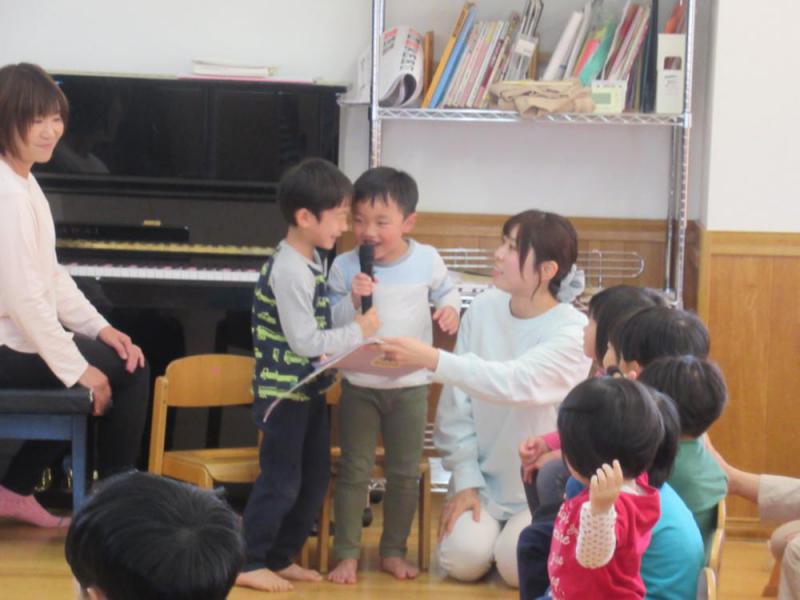 今日は11月生まれのお友だちのお誕生会でした。一人一人、ちょっぴり照れながら、それぞれの得意なことを披露してくれました。 保育者からのお楽しみは、劇「三匹のこぶた なんぶバージョン」!秋の果物大好きな、3びきのこぶたの兄弟、とんぶー、ぶーぶー、なんぶーが、それぞれお家を作りました。そこへおおかみがやってきて・・・。はらぺこすぎてお家を吹き飛ばすことができずに倒れてしまったおおかみに、3びきは、大好きな果物を使って作ったおいしいケーキを食べさせてあげる、というお話でした!子どもたちは笑ったりツッコミを入れたりしながら楽しそうに観ていました。