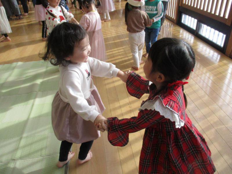 12月24日保育園でのクリスマス会がありました。クイズをしたり、「ジングルベル」の歌に合わせてみんなでダンスを楽しみました。すると外から少しずつ鈴の音が近付いてきました。外からのドアが開きサンタさんが登場すると「わあー」という歓声と笑顔がはじけていました。サンタさんからのプレゼントにさらに笑顔の子どもたちでした。