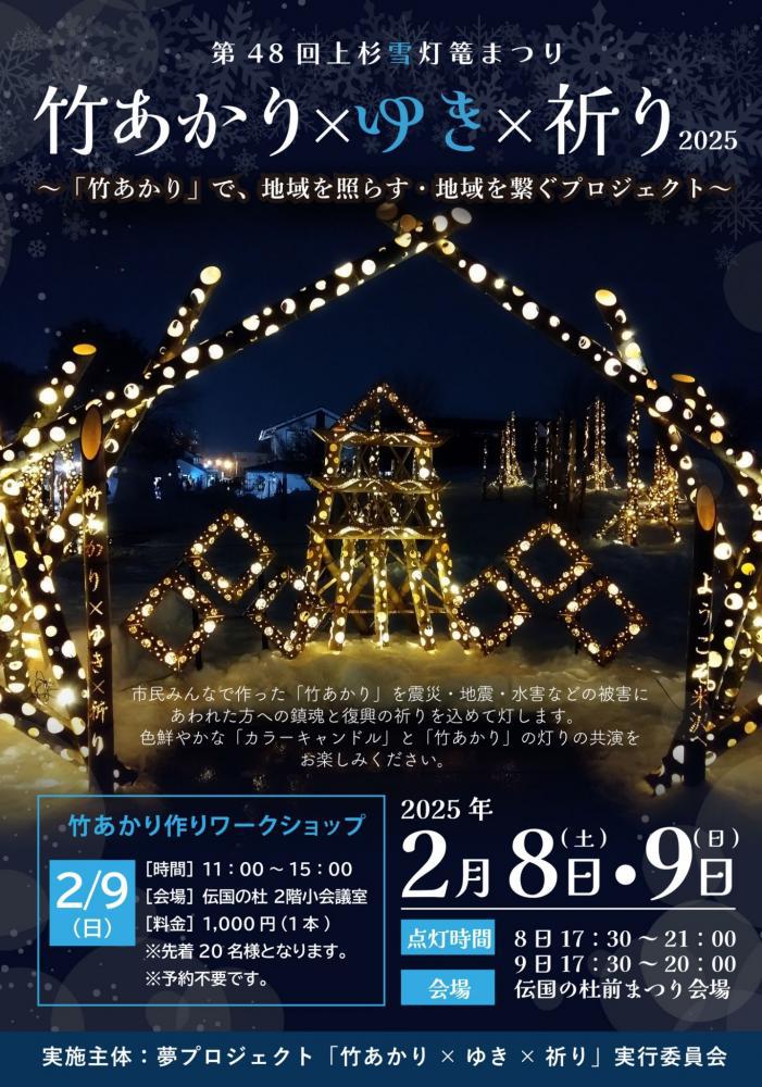 〜「竹あかり」で、地域を照らす・地域を繋ぐプロジェクト〜市民みんなで作った「竹あかり」を震災・地震・水害などの被害にあわれた方への鎮魂と復興の祈りを込めて灯します。色鮮やかな「カラーキャンドル」と「竹あかり」の灯りの共演をお楽しみください。◇開催日時 2025年2月8日(土)・9日(日) ・点灯時間 8日17:30〜21:00 9日17:30〜20:00◇会 場 伝国の杜前まつり会場◇竹あかり作りワークショップ【日時】2/9(日)11:00〜15:00【会場】伝国の杜2階小会議室【料金】1,000円(1本)※先着20名様、予約不要※同時開催 第48回上杉雪灯篭まつり直前チラシ ◆◆竹あかり作りワークショップ(各回無料)◆◆一緒に竹あかりを作っておまつりを盛りあげましょう!完成した竹あかりは、一旦お預かりし上杉雪灯篭まつり会場に飾ります。返却後はご家庭で楽しんでください!・日 時 1/25(土)1回目 10:00〜11:30 2回目 13:00〜14:30 3回目 15:00〜16:30・会 場 米沢市すこやかセンター3F視聴覚室▼竹あかり作りWS[1/25(土)]参加申し込み Googleフォームhttps://forms.gle/jJMNRZLgujUig57Y9・日 時 2/3(月)18:00〜19:30・会 場 米沢市すこやかセンター1F会議室▼竹あかり作りWS[2/3(月)]参加申し込み Googleフォームhttps://forms.gle/zFvyqSiFJSbsQPS78■お問合せは…夢プロジェクト「竹あかり×ゆき×祈り」yonezawa.takeakari@gmail.com