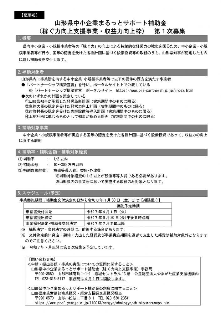 1.中小企業まるっとサポート補助金(稼ぐ力向上支援事業・収益力向上支援事業)〇補助対象:補助対象者が実施する収益力の向上に資する事業であって、経営革新計画、経営力向上計画、先端設備等導入計画、知事が認める計画に基づいて実施される設備投資○補助対象経費:設備等導入費(補助対象経費の1/2以上必須)、委託外注費※汎用機器(PC等)は原則対象外、例外的に10万円未満で必要性が明確な場合のみ可 〇〇補助率:2分の1以内〇補助金額:10万円〜300万円 2. 中小企業まるっとサポート補助金(稼ぐ力向上支援事業・DX推進枠)〇補助対象:DXの推進やデジタル技術活用による生産性向上、業務改善等の設備投資〇補助率:2分の1以内〇補助金額:10万円〜100万円 3. 中小企業まるっとサポート補助金(事業継続力強化支援事業)○補助対象:県内中小企業・小規模事業者が事業継続力強化計画またはBCPの策定に基づいて行う、防災設備等の導入に関する事業〇補助率:3分の2以内〇補助金額:10万円〜50万円 ※詳細については、山形県中小企業まるっとサポート補助金 | 山形県をご確認ください。