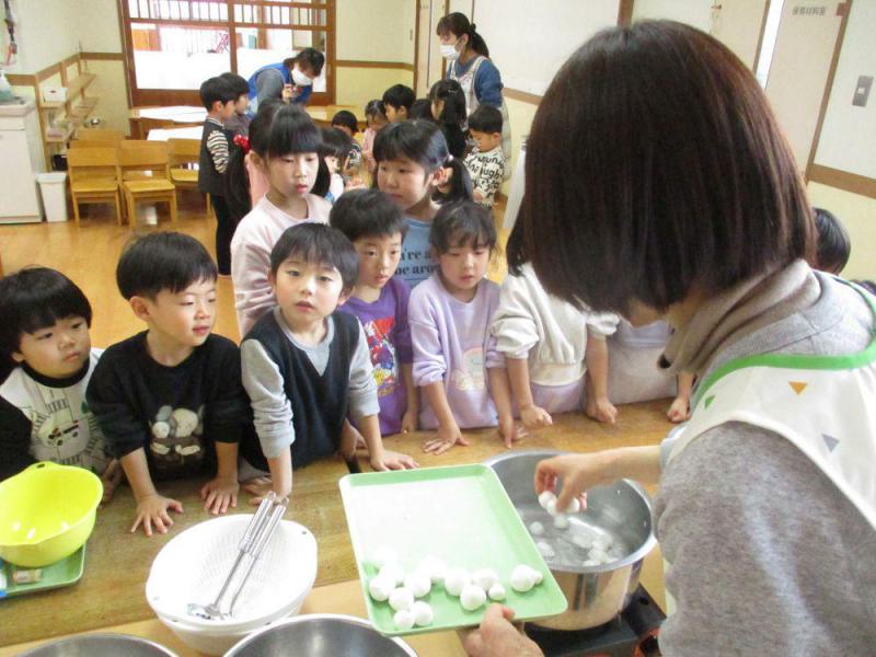 1月15日の小正月に団子の木飾りをしました。「ミズキの木で火事になりませんように」「風邪などひかず元気にすごせますように」と四季を彩る4色の団子をつくり飾りました。子どもたちは小さいかわいい手で団子を作り、真剣な表情で団子を木に刺したり、折り紙で作った飾りをつけました。