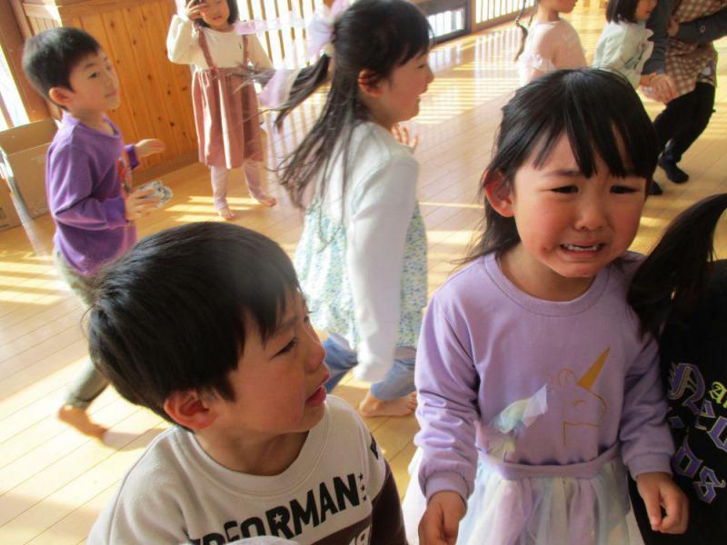 季節の変わり目に悪いものが入ってこないよう鬼を退治しよう!と「えいえいおー!」と大きな掛け声で豆まき(新聞玉)を行いました。果敢に鬼に向かって投げる子、怖くて泣いてしまう子、友だちを助けようとする子と様々な姿が見られました。鬼が去った後は福の神からおいしい甘納豆をもらい、邪気祓い後に今年1年の幸せを願いました。