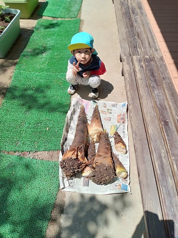 連休中の雨で、竹林の筍が生長してきました。久しぶりの晴天の空の下、子どもたちと一緒にタケノコ掘りを行い、立派な筍が収穫できました。筍は、一年の大半を土地の中でじっと力を蓄え、春になり待っていたかのように蓄えた力を放出し一気に育ちます。その生命力は一日数十センチ伸びるほどです。子どもたちと一緒に、生命の生長の逞しさと自然の恵みの尊さを感じていきたいと思います。