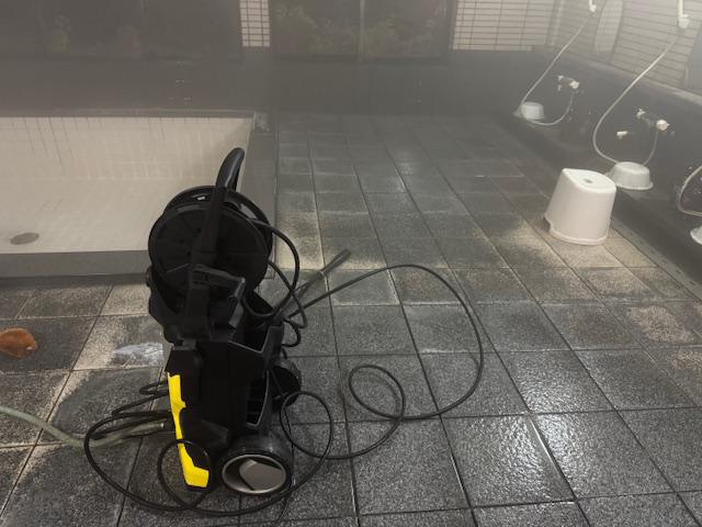 夜に大浴場を掃除しています。GW期間はたくさんの方がお越しになるので、気合を入れてがんばっています。たわしでゴシゴシする日もあれば、高圧洗浄機をかける日もある。GW、温泉と一緒にお待ちしています〜