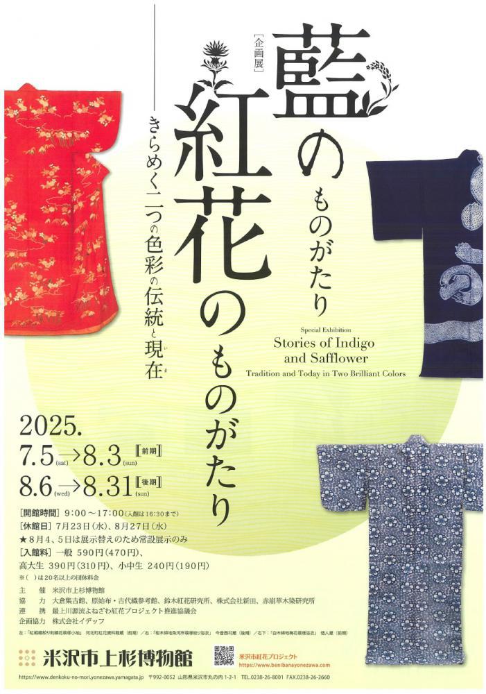 米沢市上杉博物館にて、企画展「藍のものがたり 紅花のものがたり」が開催されます。藍と紅花の二大染料の色彩と染色技法の歴史、そのから生まれた意匠や衣服を紹介し、その魅力を再発見します。<日時>前期:令和7年7月5日(土)〜8月3日(日) 後期:令和7年8月6日(水)〜8月31日(日)【開館時間】9:00〜17:00(入館は16:30まで)【休館日】7月23日(水)、8月27日(水) <場所>米沢市上杉博物館<入場料>一般:590円高大生:390円小中生:240円<問い合わせ>米沢市上杉博物館 0238-26-8001詳細は、チラシをご覧ください。