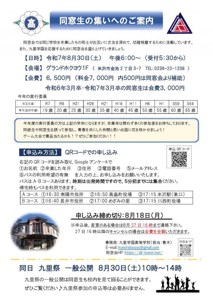 【日 時】 令和7年8月30日(土) 午後6:00から (受付5:30から)【会 場】 グランドホクヨウ 1F (米沢市金池 2 丁目 3 -7 TEL: 0238-22-1238)【会 費】 6,500円(令和6年・令和7年3月卒の同窓生は3,000円)申し込みはこちら↓https://docs.google.com/forms/d/e/1FAIpQLSeIN_ZL3PTHOv8vxzzNowANiX2s_AbmDZHae-i7AMts4iZoUw/viewform
