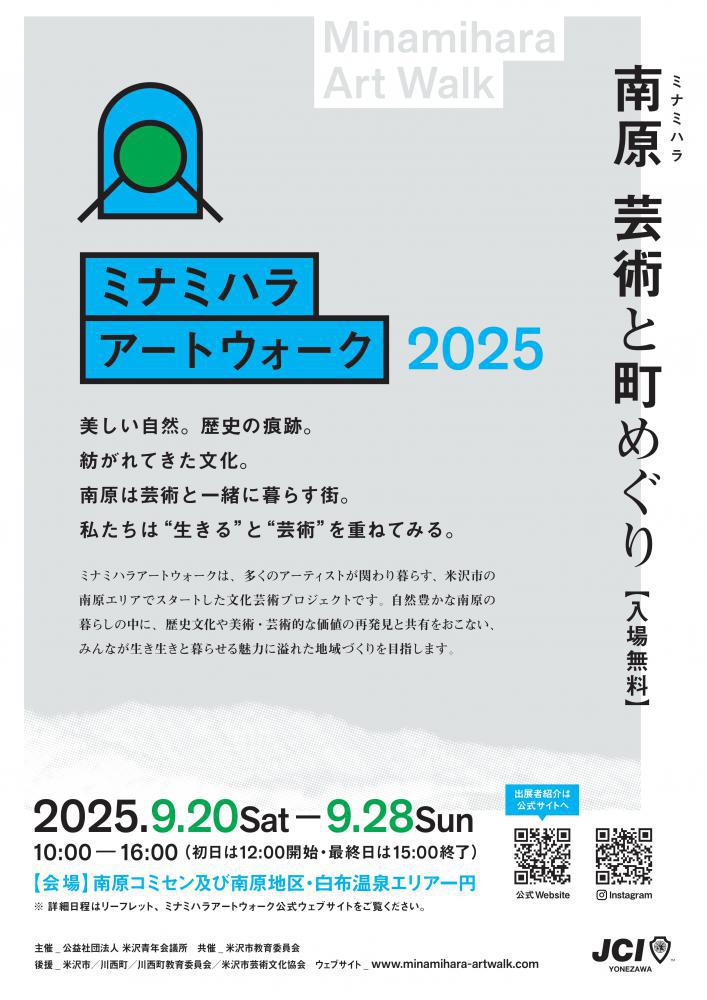 ミナミハラアートウォーク 2025 9月20日(土)〜28日(日)[9日間開催]〜山形県米沢市 南原地区・白布温泉エリア一円〜2021年からスタートしたミナミハラアートウォークも今年で5周年を迎えます。地域とアートが寄り添い育まれてきたこの歩みに、今年は新たな光を灯します。テーマは “一隅を照らす” - キボウノヒカリ地域で暮らす人々が灯す光。作家たちが創り出す芸術の光。その一つひとつの光が繋がり、未来への希望となっていく——。物質的な豊かさがあふれる一方で、心の豊かさや人間性が置き去りにされる現代。今こそ、「生きる」と「芸術」を重ね合わせ、新しい価値を見つけるときかもしれません。南原の地に生まれる小さな光は、きっとあなた自身が「一隅を照らす」存在であることに気づかせてくれます。芸術を「心の糧」として、この秋、小さな一歩をともに踏み出しましょう。 詳細は今後、Instagramにて順次公開。ぜひフォローしてお待ちください。◇開催日時 2025年9月20日(土)〜28日(日)【9日間】 10:00〜16:00※初日は12:00開始、最終日は15:00終了◇開催場所 南原コミセン及び南原地区・白布温泉エリア一円【主催】公益社団法人米沢青年会議所ミナミハラアートウォーク公式ホームページはこちらをご覧ください。