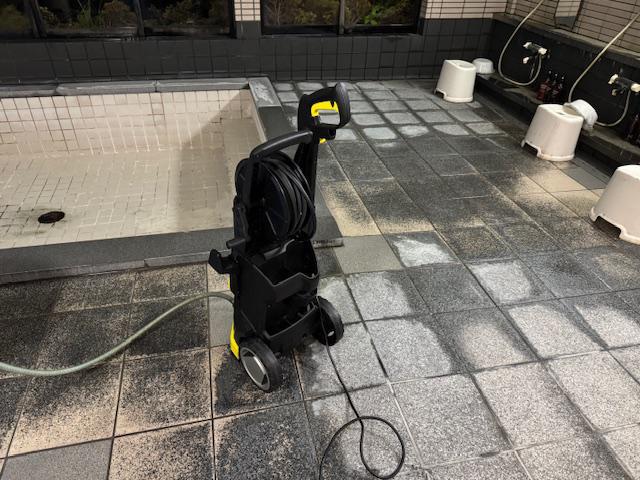 日々、夜に大浴場掃除をしていますが、基本はたわしでゴシゴシしています。時々、使用するのが、高圧洗浄機、水のパワーで汚れを落としていきます。たまに使うと、やはり高圧洗浄機は違うなといつも感じさせてくれます。今後も大事に使っていこう、そして、お風呂をきれいにしていこう〜