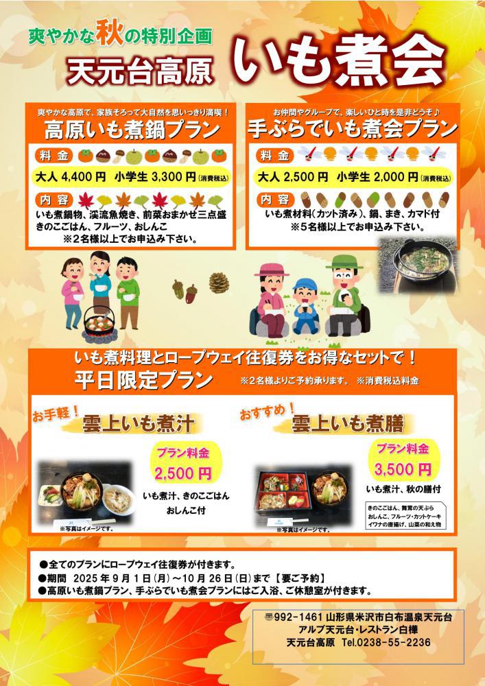 秋風かおる西吾妻山、山形の秋の風物詩「芋煮会」のシーズンがやってきました!天元台高原では、「高原いも煮鍋プラン・手ぶらでいも煮会プラン」を9月1日から実施しています。天元台高原の秋を満喫しにぜひお越しください!◇高原いも煮鍋プラン・料金:大人4,400円(税込)小学生3,300円(税込)・内容:いも煮鍋物、渓流魚焼き、前菜おまかせ三点盛 きのこごはん、フルーツ、おしんこ※2名様以上でお申し込みください。※レストラン白樺内でのご提供となります。◇手ぶらでいも煮会プラン・料金:大人2,500円(税込)小学生2,000円(税込)・内容:いも煮材料(カット済)、鍋、まき(かまど付き)※5名様以上でお申し込みください。※飲料、おにぎり等必要な場合は別途ご相談ください。●高原いも煮鍋プラン、手ぶらでいも煮会プラン、どちらにもロープウェイ往復券、ご入浴、ご休憩室が付きます。●開催期間:2025年9月1日(月)〜10月26日(日)※要予約:アルブ天元台TEL:0238-55-2236【お問い合わせ】天元台高原 TEL:0238-55-2236