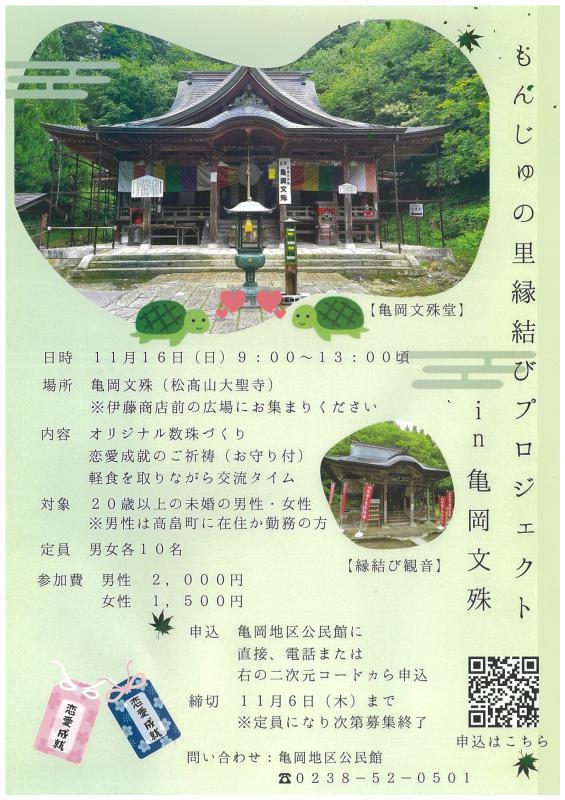 学問のお文殊様として有名な「亀岡文殊」ですが、亀岡文殊堂のそばに「縁結び観音」があるのはご存じでしょうか?婚活(恋活)イベントを行うようです。皆さまに良いご縁がありますように。ぜひご参加ください。■お問合せ 亀岡地区公民館 0238-52-0501■場所 亀岡文殊(松高山大聖寺)