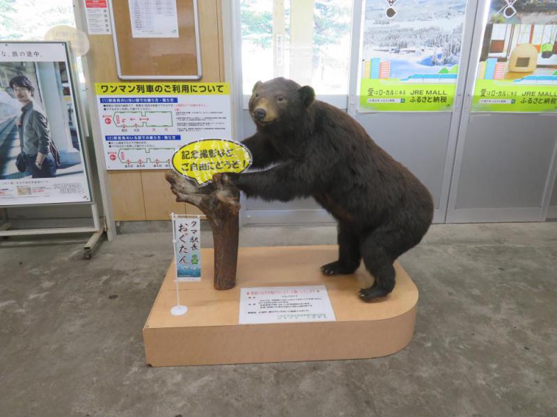 小国駅は1935年(昭和10年)10月30日に開業。米坂線でも貴重なJR直営の有人駅である。赤屋根と白壁のコントラストが美しく2002年(平成14年) に旧長井駅や荒砥駅と共に「東北の駅百選」に選定されている。米屋こうじさんは「昔の役場のような風格ある建物が風景に良く似合っている。」と評している。(「鉄道ファイル」2008年) 待合室に入ると、すべての窓にはカーテンが引かれていたが、隙間から事務室の灯りが見えた。運休となった今でも、職員が働いているのだろう。そんな気配を感じられただけでも嬉しかった。そして正面には「クマ駅長おぐたん」が鎮座している。最近でこそ「クマ」はとても迷惑な存在となっているが、小国町はマタギ文化を柱の一つにしながら、熊祭りなどをとおして地域活性化に取り組んでいたのである。 クマ駅長の台座には町観光協会と小国駅長の名前があった。「駅からハイキング」などJRと地域の協同事業が行われていたが、「クマ駅長おぐたん」は駅と町の協働の歴史を伝えるもののような気がした。列車が止まっている今、クマ駅長は何を思うのだろうか。