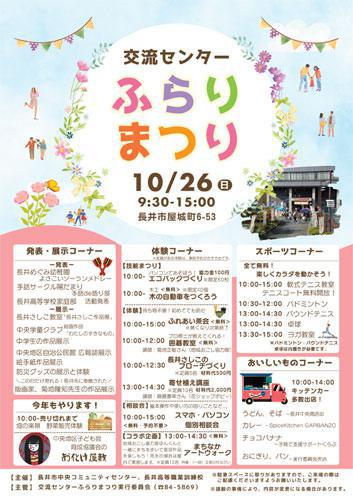 ※この事業は終了しました。ご来場、ご協力ありがとうございました。 今年も交流センターふらりまつりの季節がやってきました!長井市中央コミュニティセンターと長井高等職業訓練校の合同の文化祭です。(一財)文教の杜ながいと共催して行うまちなかアートウォーク、体を動かす体験(バドミントン、卓球、ヨガ、バウンドテニス、ソフトテニス)、ものづくり体験(長井さしこ、木工、アイロンプリント、寄せ植え)、長井めぐみ幼稚園や手話サークル「陽だまり」、長井高校家庭部の発表や地域のみなさんの作品展示、など楽しいことが盛りだくさん!お茶会やお化け屋敷、スタンプラリーに福引、おいしい食べ物の売店もありますよ。 盛りだくさんな内容がギュッと詰まった1日です。みなさまお誘いあわせのうえ、ぜひご来場ください。 ▽チラシはこちら表面 裏面(PDF) 主催:長井市中央コミュニティセンター、長井高等職業訓練校主管:交流センターふらりまつり実行委員会(長井市屋城町6-53 電話84-5869)※駐車スペースに限りがありますので、ご来場の際はご配慮くださいますようお願いいたします。※諸般の事情により、内容が変更になる場合があります。 Instagramはこちら